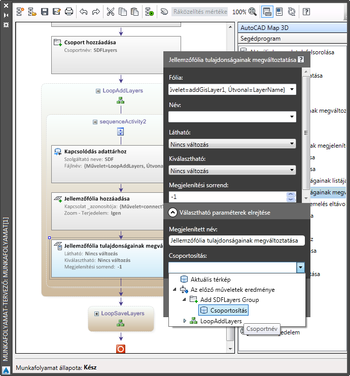 Bontsa ki a Választható paraméterek megjelenítése részt. Kattintson a Csoport mező mellett található lefele nyílra, majd Az előző műveletek eredménye területen bontsa ki az Add SDFLayers Group műveletet és válassza a Csoport elemet.