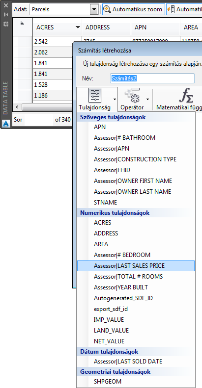 Most a tulajdonosi adatokat a Telkek fóliához csatolta, és az eredményt új adattárba mentette. A kombinált információval létrehozhat egy számított tulajdonságot. A számított tulajdonság egy kifejezés eredménye: ebben az esetben a legfrissebb eladási ár osztva a területtel.