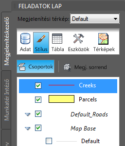 A Megjelenítéskezelő lap az aktuális térkép fóliáit jeleníti meg.