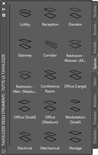 Le tavolozze personalizzate create dall'amministratore CAD o da altri utenti possono anche contenere strumenti Vano con stili e proprietà di vano personalizzati per i propri progetti o standard aziendali.
