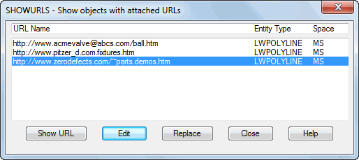 Immettere SHOWURLS per visualizzare la finestra di dialogo Showurls. È possibile fare clic su un singolo URL per visualizzarlo oppure fare clic su uno o più URL per modificarli o sostituirli.