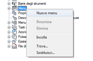 Nella scheda Personalizza, nel riquadro Personalizzazioni in <nome file>, fare clic con il pulsante destro del mouse sul nodo Menu. Fare clic su Nuovo menu.