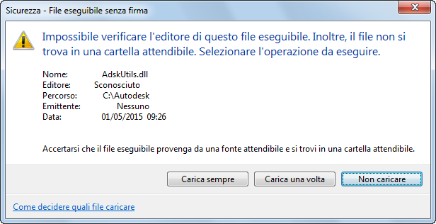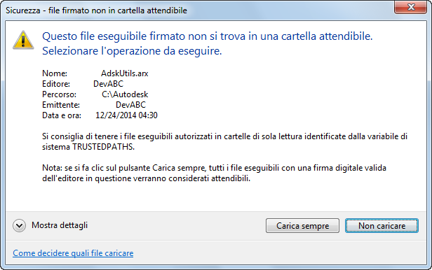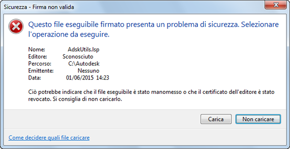 Durante il caricamento di un file di programma personalizzato con firma digitale, il programma basato su AutoCAD verifica la firma digitale allegata al file. Viene visualizzata una finestra di messaggio, se la firma digitale può essere verificata, che consente all'utente di caricare o meno il file di programma nell'ambiente di disegno.