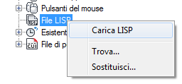 Nella scheda Personalizza, nel riquadro Personalizzazioni in <nome file>, fare clic con il pulsante destro del mouse sul nodo File LISP. Fare clic su Carica LISP.