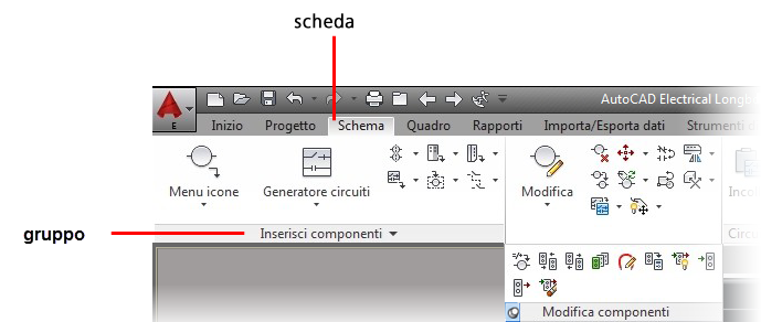 Generatore circuiti, Schema è il nome della scheda, Inserisci componenti è il nome del gruppo nella scheda e Generatore circuiti è il nome del comando.