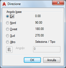 Imposta la direzione dell'angolo zero. Le opzioni che seguono hanno effetto sull'immissione degli angoli, sul formato di visualizzazione e sull'immissione delle coordinate polari, cilindriche e sferiche.