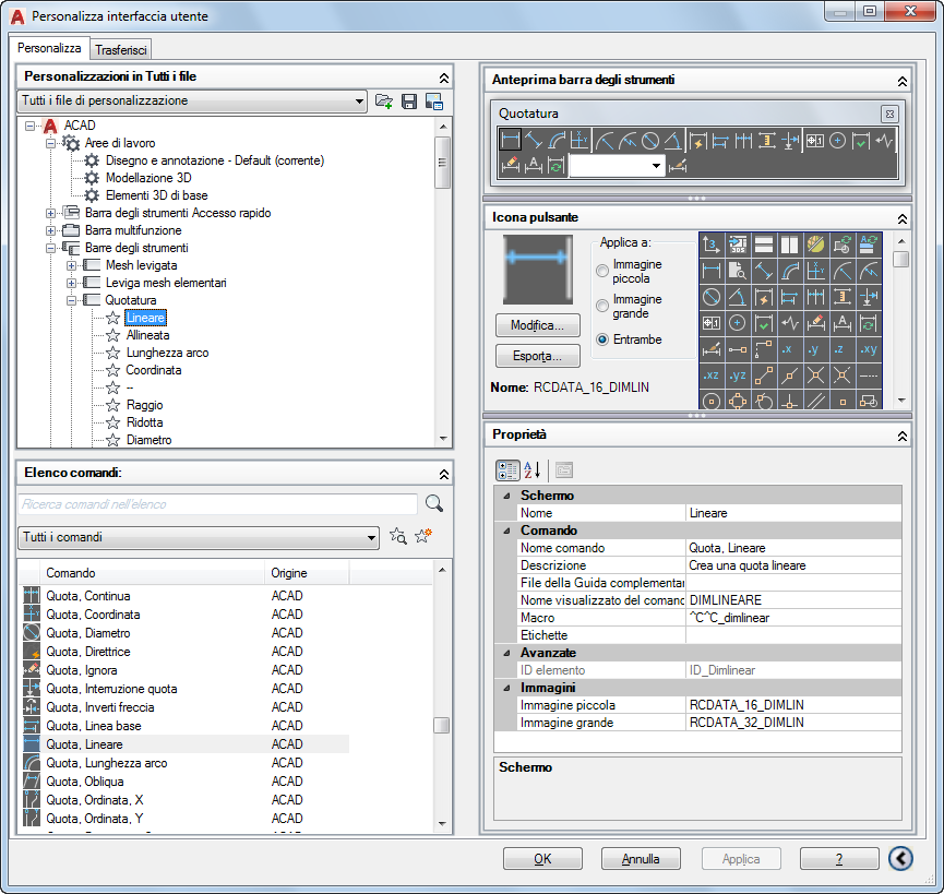 Fornisce un'interfaccia per la personalizzazione di aree di lavoro, barre degli strumenti, menu, gruppi della barra multifunzione, menu di scelta rapida e altri elementi dell'interfaccia utente.