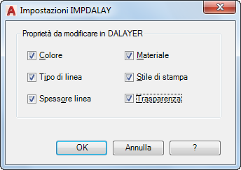 Imposta su DaLayer le modifiche locali di colore, tipo di linea, spessore di linea, materiale, stile di stampa e trasparenza per gli oggetti selezionati e i blocchi inseriti nei layer non bloccati.