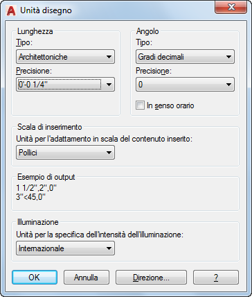 che include Architettonico, Decimale, Ingegneristico, Frazionario e Scientifico. I formati Ingegneristico e Architettonico producono visualizzazioni in piedi e pollici e presuppongono che ogni unità di disegno equivalga ad un pollice. Gli altri formati possono rappresentare qualsiasi unità di misura reale.