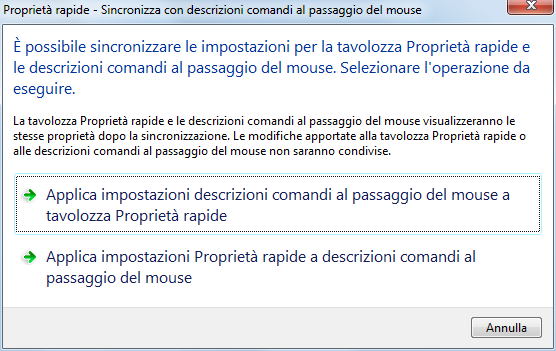 Sincronizzazione delle proprietà rapide con le descrizioni comandi al passaggio del mouse