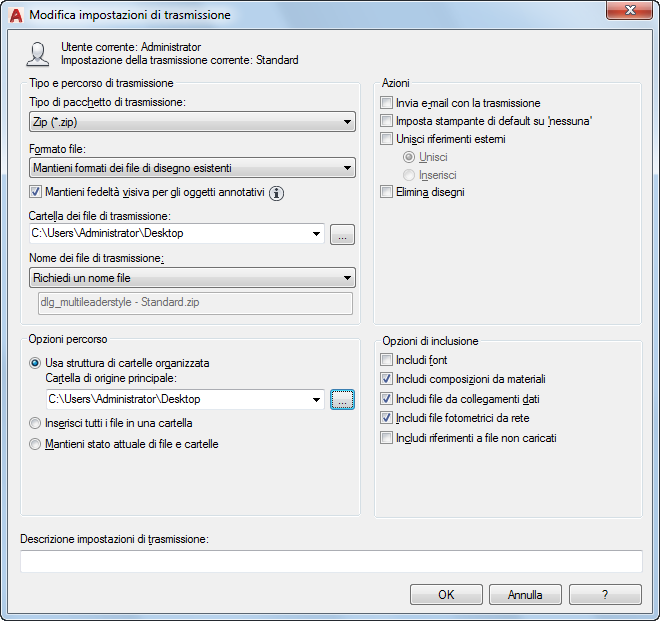 Se il campo dati viene lasciato invariato, il file di trasmissione viene creato nella cartella contenente il primo file di disegno specificato. Nel contesto di un gruppo di fogli, il file di trasmissione viene creato nella cartella contenente il file di dati del gruppo di fogli (DST). Questa opzione non è applicabile ad AutoCAD LT.