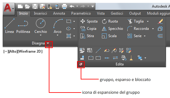 È possibile selezionare un gruppo da una scheda della barra multifunzione e trascinarlo nell'area di disegno o in un altro monitor. Il gruppo mobile resta aperto finché non viene ricollocato nella barra multifunzione, anche se si passa da una scheda all'altra della barra multifunzione.