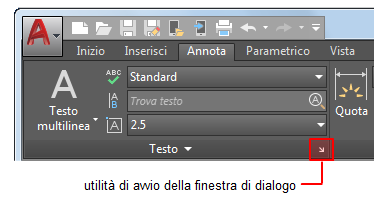 Alcuni gruppi della barra multifunzione consentono di accedere ad una finestra di dialogo correlata. Per visualizzare la finestra di dialogo, fare clic sull'utilità di avvio finestra di dialogo indicata da un'icona a forma di freccia, , nell'angolo inferiore destro del gruppo.