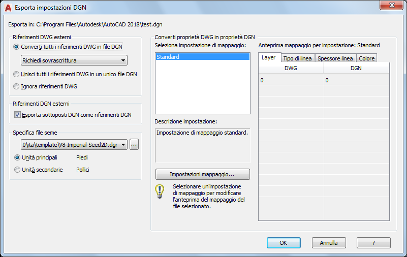 Elenca tutte le proprietà sia del file DWG esportato nella colonna DWG che dell'impostazione di mappaggio selezionata nella colonna DGN.