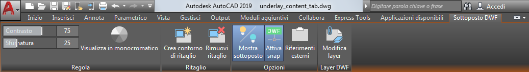 Consente di cambiare la visualizzazione, il ritaglio, il layer e le opzioni osnap del sottoposto DWF.