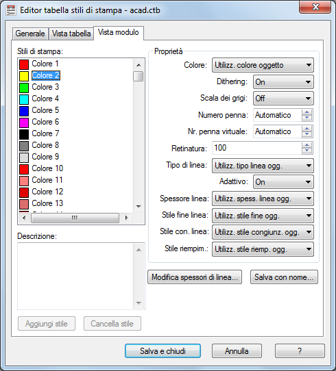 Sono disponibili 28 spessori di linea da applicare agli stili di stampa contenuti nella tabella stili di stampa. Se lo spessore di linea desiderato non è presente nell'elenco memorizzato nella tabella stili di stampa, è possibile modificarne uno esistente. Non è possibile aggiungere o eliminare spessori di linea dall'elenco visualizzato nella tabella stili di stampa.