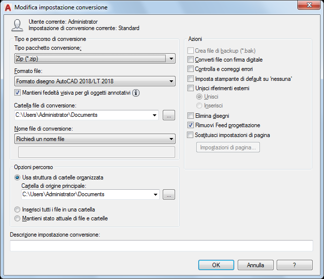 Consente di specificare il tipo di pacchetto di conversione associato all'impostazione di conversione selezionata, insieme alla posizione e alle opzioni univoche dello stesso.