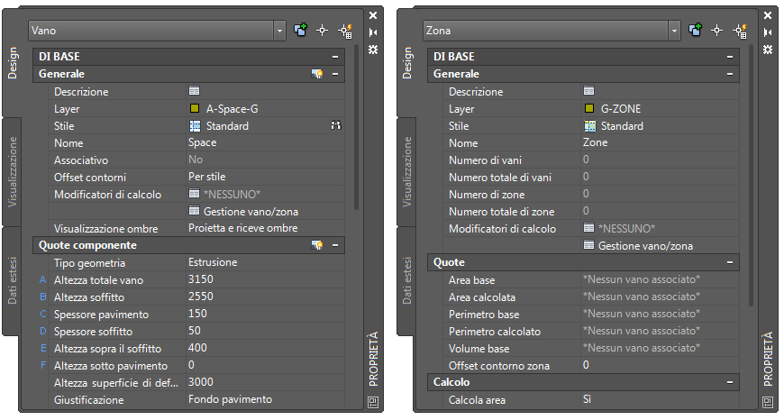- Per visualizzare i calcoli, fare clic su un vano o su una zona, quindi nel riquadro proprietà selezionare la scheda Dati estesi.