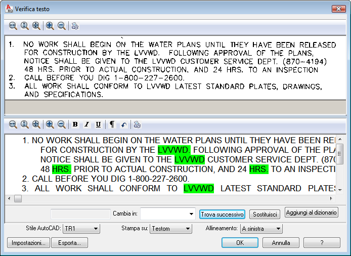 Le impostazioni selezionate nella finestra di dialogo Impostazioni riconoscimento testo definiscono i parametri per il motore di ricerca. I risultati della ricerca sono visualizzati nella finestra Verifica testo, dove è possibile effettuare le necessarie correzioni ed immettere il nuovo testo nel disegno.
