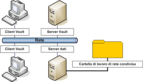 Quando le cartelle di lavoro vengono mantenute nei computer locali, come illustrato nella figura 7, il traffico di rete viene ridotto al minimo e i membri del team possono lavorare non in linea fuori sede o da casa. Gli utenti creano traffico di rete solo quando archiviano o estraggono i file dal Vault.