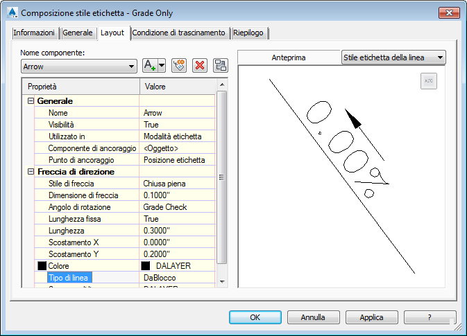 Lo stile di etichetta di default Grade Only consente di visualizzare la pendenza % mediante una freccia di direzione che punta nella stessa direzione della linea caratteristica.