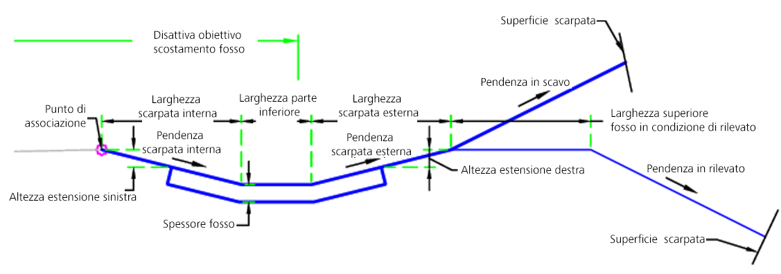 Il componente sezione tipo Fosso rilevato pendenza laterale inserisce collegamenti per la creazione di un fosso facoltativo e le scarpate per scavo e rilevato.