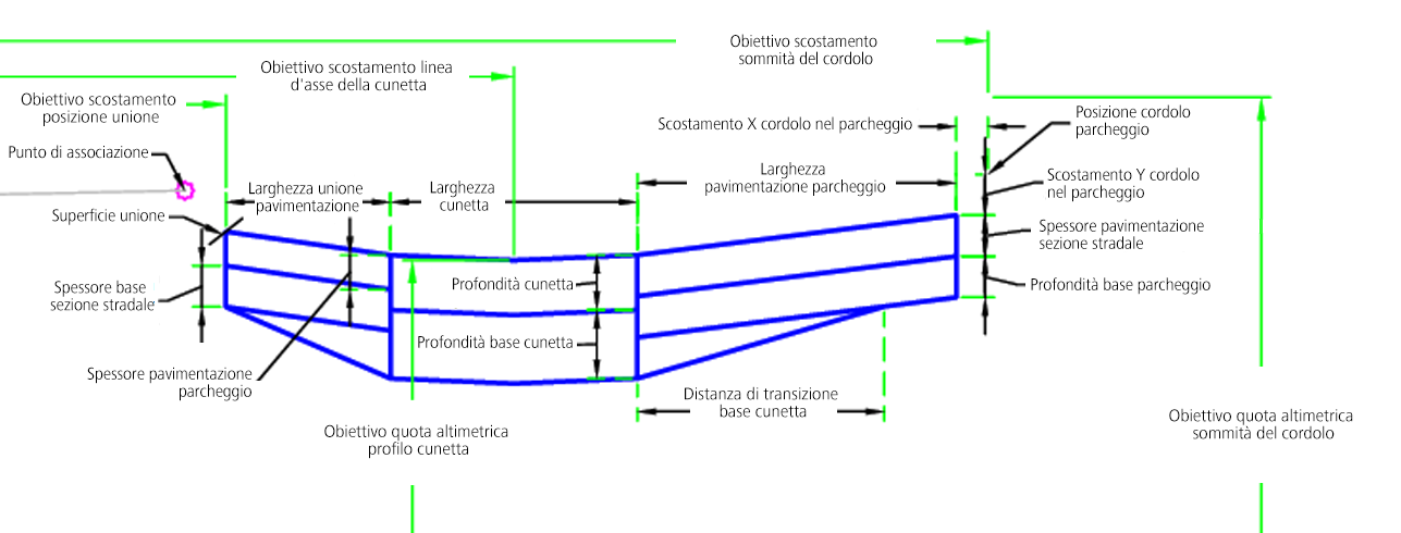 | Scostamento sommità del cordolo | Utilizzato per determinare la quota altimetrica della sommità del cordolo nella posizione del collegamento del cordolo del parcheggio. Come obiettivi per la specifica della quota altimetrica è possibile utilizzare i seguenti tipi di oggetti: profili, polilinee 3D, linee caratteristiche o figure di rilievo. | Obbligatorio |