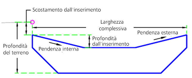 Il punto iniziale è impostato in corrispondenza del punto di associazione. La posizione del giardino pluviale viene quindi regolata in base alla distanza di scostamento immessa. La profondità del giardino pluviale è impostata secondo i valori di input.