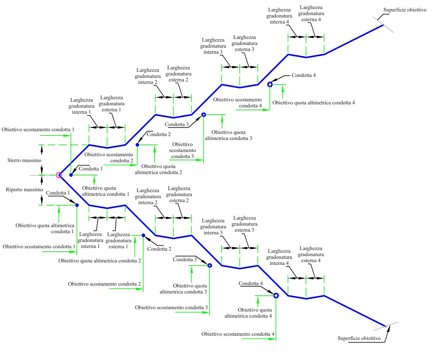 In corrispondenza di ciascuna gradonatura viene inserita una condotta, alla distanza specificata nei parametri di input, oppure la condotta viene sostituita utilizzando obiettivi per l'offset e la quota altimetrica. Se le dimensioni della condotta sono pari a 0 la condotta viene omessa.