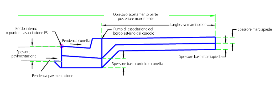 | Punto di associazione | Punto di associazione del cordolo o di cordolo e cunetta | Bordo interno o FS/Esterno del cordolo | Bordo interno o FS |