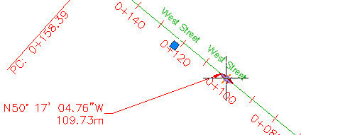 Vengono selezionati entrambi i tracciati Main Street e East Street e le relative etichette di progressiva. Le etichette sono state selezionate perché sono state create nella Carta con riferimenti esterni in cui risiedono i tracciati. Quando un oggetto viene creato tramite un riferimento esterno, le etichette possono essere modificate solo nella Carta di origine.