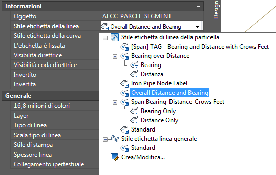 Elenco di stili di etichetta disponibili nella tavolozza Proprietà di AutoCAD