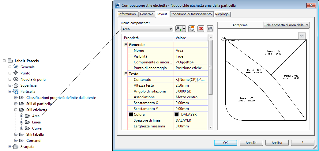 Le etichette dell'area della particella vengono visualizzate nella Carta come mostrato nell'anteprima della finestra di dialogo Composizione stile etichetta