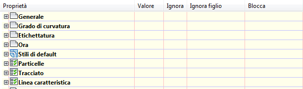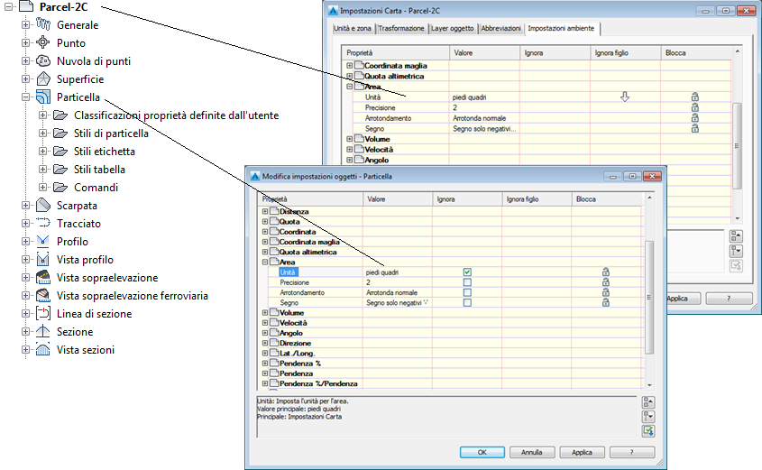 Il segno di spunta nella colonna Ignora della finestra di dialogo Modifica impostazioni oggetti - Particella (finestra di dialogo inferiore) indica che il valore impostato in questa finestra di dialogo sostituisce l'impostazione ad un livello superiore.