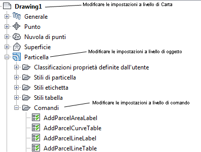 Autodesk Civil 3D consente di regolare le impostazioni per Carte, oggetti e comandi. Tutti e tre i livelli di impostazioni di Autodesk Civil 3D vengono salvati con la Carta ed è possibile salvarli anche in un modello Carta.