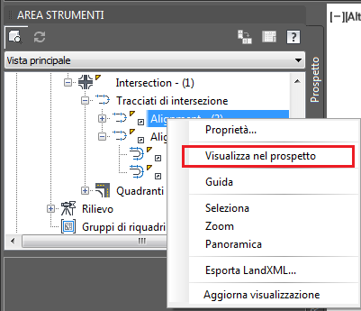 Un altro oggetto disponibile nella raccolta Tracciati di intersezione è il comando Visualizza nel prospetto.