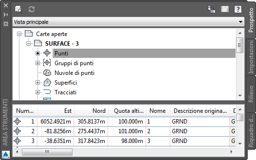 Una vista elenco è una tabella visualizzata dalle strutture dell'Area strumenti per alcuni elementi. In alcuni casi queste informazioni possono essere modificate. Nella seguente figura è illustrata una vista elenco di punti nella scheda Prospetto: