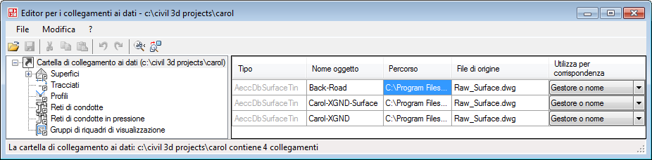 Le modifiche effettuate nella finestra dell'Editor per i collegamenti ai dati vengono applicate in occasione del successivo caricamento dei collegamenti. Per ricaricare i collegamenti, impostare la cartella dei collegamenti ai dati o chiudere Autodesk Civil 3D e riavviarlo.