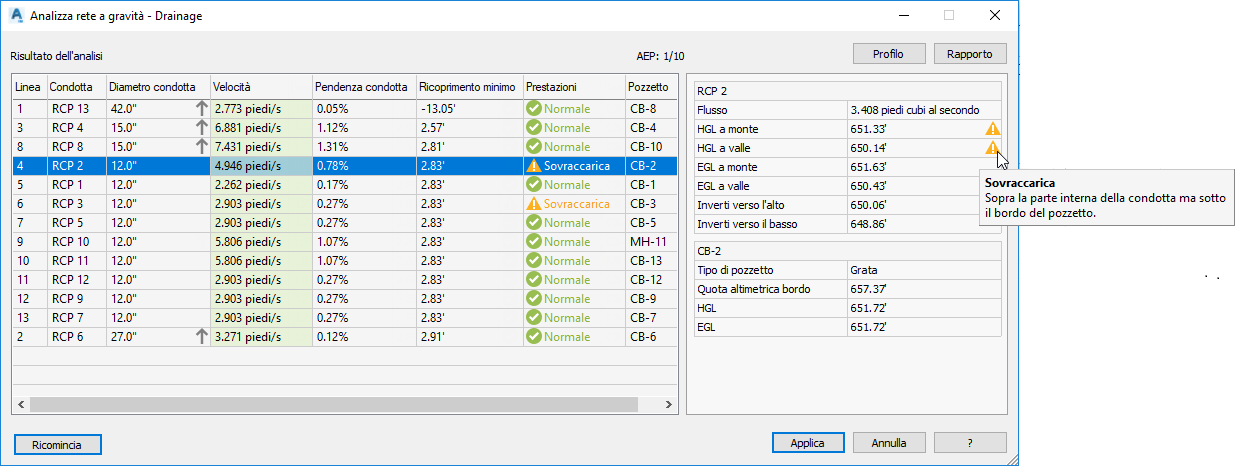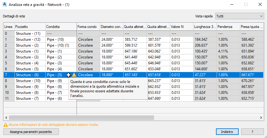 Quando si seleziona una riga nella tabella dei risultati, il riquadro a destra mostra informazioni dettagliate sulla condotta e sul pozzetto nella linea selezionata.