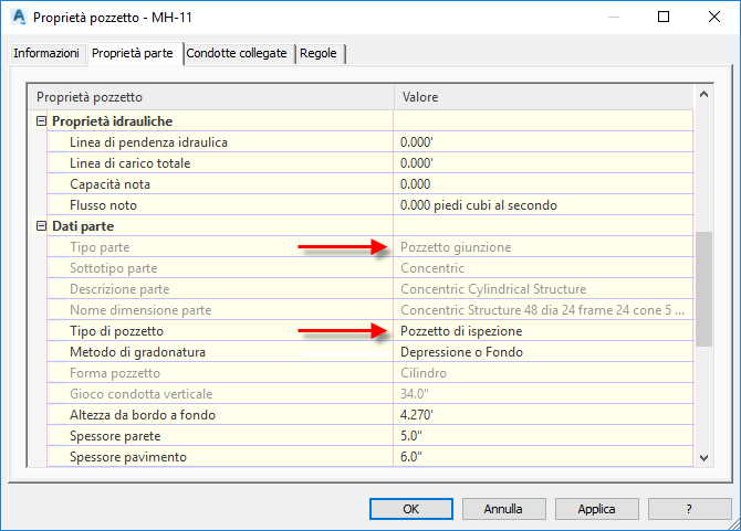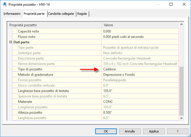 Le impostazioni di default per i pozzetti possono essere specificate nella finestra di dialogo Modifica impostazioni oggetti - Pozzetto .