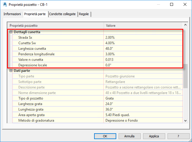È possibile utilizzare la sezione Dettagli cunetta della finestra di dialogo Proprietà pozzetto per definire le proprietà dell'area stradale intorno alla presa. Queste proprietà vengono utilizzate dal comando Analisi rete a gravità per il calcolo dell'analisi della presa.