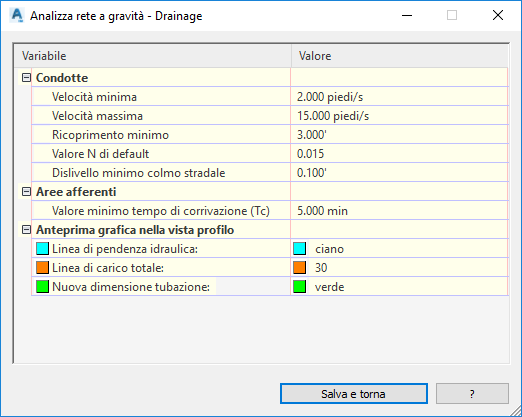 Le impostazioni che devono essere specificate manualmente per le aree e le condotte afferenti o che sono utilizzate come valori nei calcoli delle analisi possono essere predefinite come default nella pagina Impostazioni. Fare clic sul pulsante Impostazioni nella pagina Generale per aprire questa finestra di dialogo.