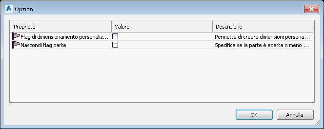 2. Verificare che le caselle di controllo della colonna Valore delle proprietà Flag di dimensionamento personalizzato e Nascondi flag parte siano rispettivamente deselezionata e selezionata, quindi fare clic su OK.