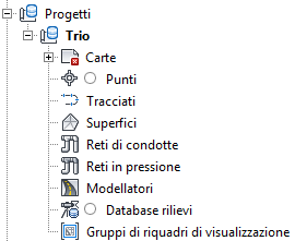 Un progetto contiene raccolte di oggetti di progetto, quali superfici, tracciati, profili, reti di condotte, reti in pressione e gruppi di riquadri di visualizzazione, che possono essere condivisi con altri utenti. Tutti gli oggetti di progetto condivisi vengono elencati nei gruppi di oggetti di progetto nella struttura Prospetto. I membri del progetto possono creare in una Carta una copia di sola lettura di un oggetto di progetto, denominata riferimento. È possibile utilizzare questa copia della geometria dell'oggetto di progetto per eseguire attività di etichettatura, progettazione, analisi o per scenari di simulazione.
