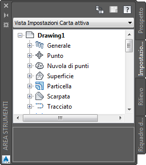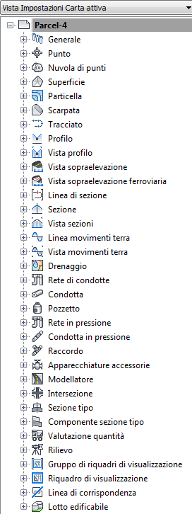È possibile utilizzare la scheda Impostazioni per gestire gli stili degli oggetti di Autodesk Civil 3D e per controllare le impostazioni delle Carte e dei comandi.
