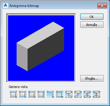 Attenersi alla procedura indicata di seguito per generare un'immagine di anteprima della parte da utilizzare durante la selezione della parte stessa. Generatore di parti genera l'immagine di anteprima in base ad una direzione vista specificata. Per visualizzare il modello, è possibile scegliere tra dieci direzioni vista AutoCAD standard (dall'alto, dal basso, da sinistra, da destra, anteriore, posteriore, assonometrica SO, assonometrica SE, assonometrica NE e assonometrica NW).
