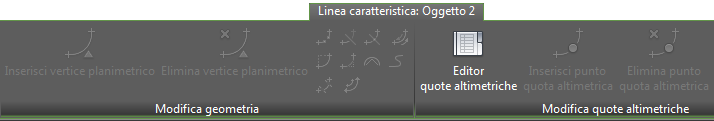 Quando una linea caratteristica è collegata ad un modellatore in modo dinamico, la maggior parte dei comandi di modifica delle linee caratteristiche non è disponibile nella barra multifunzione. L'illustrazione seguente mostra i gruppi di modifica nella barra multifunzione contestuale Linea caratteristica quando viene selezionata una linea caratteristica dinamica. È possibile utilizzare l'Editor quote altimetriche e il comando Modifica rapida quota altimetrica per visualizzare i dati ma non modificarli.