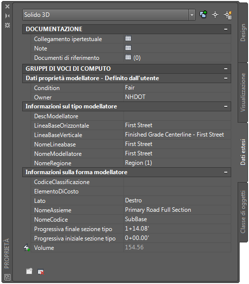 Per default, Autodesk Civil 3D include tre definizioni gruppo proprietà applicabili a solidi e corpi 3D e ai modellatori: