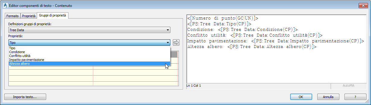 È possibile applicare il gruppo di proprietà ai punti, quindi aggiungere i dati del gruppo di proprietà rilevanti allo stile di etichetta di proiezione utilizzando l'Editor componenti di testo.