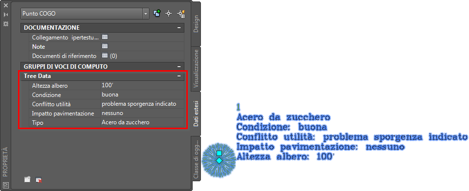 È possibile impostare stili di etichetta personalizzati che includano i dati dei gruppi di proprietà configurati per gli oggetti di Autodesk Civil 3D.